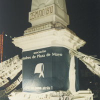 - Imagen de la Pirámide de Mayo envuelta en una bandera de la Asociación Madres de Plaza de Mayo y rodeada de fotografías de desaparecidos