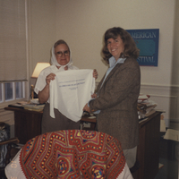 - Imagen de Nora Cortiñas junto a una persona no identificada sosteniendo el pañuelo de Madres de Plaza de Mayo, Línea Fundadora