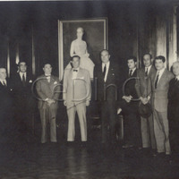 - Epígrafe: El primer mandatario bonaerense, señor Carlos Aloé, durante la visita que le efectuaron a su despacho oficial de la Casa Rosada, el presidente del Mercado General de Hacienda de Avellaneda, doctor Alejandro Leoir y los integrantes de la Comisión Administradora.