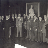- Carlos Aloé con la delegación de futbolistas agremiados. De fondo, un retrato de Eva Duarte de Perón