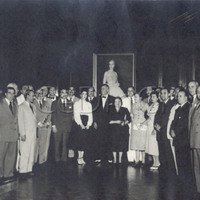 Carlos Aloé con un grupo. De fondo, un retrato de Eva Duarte de Perón. .