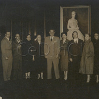 Carlos Aloé con un grupo. De fondo, un retrato de Eva Duarte de Perón. .