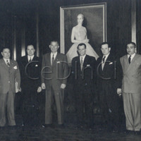 Carlos Aloé con un grupo. De fondo, un retrato de Eva Duarte de Perón. .