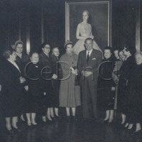 - Carlos Aloé con un grupo de mujeres. De fondo, un retrato de Eva Duarte de Perón.