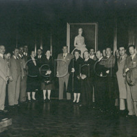 Carlos Aloé con un grupo. De fondo, un retrato de Eva Duarte de Perón. .