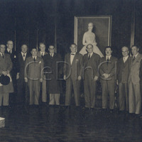 Carlos Aloé con un grupo. De fondo, un retrato de Eva Duarte de Perón. .
