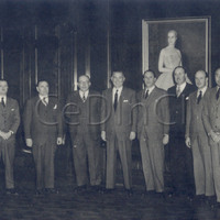 Carlos Aloé con un grupo. De fondo, un retrato de Eva Duarte de Perón. .