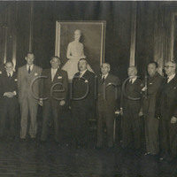 Carlos Aloé con un grupo. De fondo, un retrato de Eva Duarte de Perón. .
