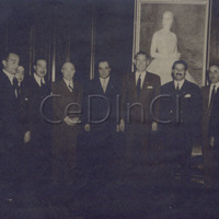 Carlos Aloé con un grupo. De fondo, un retrato de Eva Duarte de Perón. .