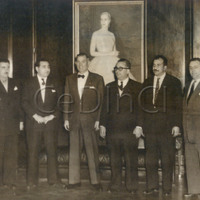 Carlos Aloé con un grupo. De fondo, un retrato de Eva Duarte de Perón. .