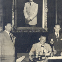- Discurso de Carlos Aloé. De fondo, un retrato de Juan Domingo Perón.