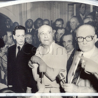- Héctor José Cámpora en una conferencia de prensa. A su lado está Juan Manuel Abal Medina. De fondo, retrato de Juan Domingo Perón