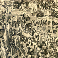 - Multitud reunida. Retratos de Juan Domingo Perón y Eva Duarte de Perón. Banderas de sindicatos. (sin Más datos)