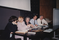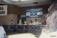 Cátedra Libre Poder Económico y Derechos Humanos de la Facultad de Ciencias Económicas (Buenos Aires, Argentina). [1999]. Mesa con oradores exponiendo en el marco de la Cátedra