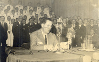 Discurso de Juan Domingo Perón. A su lado, está Eva Duarte de Perón