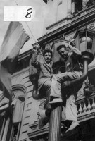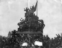 Manifestantes subidos en un poste de luz.