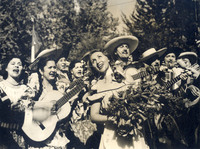 Acto oficial peronista, con civiles y mllitares, durante las dos primeras presidencias de Juan D. Perón. Se ve una pancarta con un retrato Perón : "SÍMBOLO DE LA VERDAD EN LATINOAMÉRICA".
