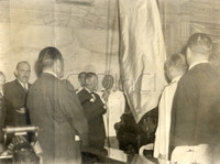 Discurso de Juan Domingo Perón en el departamento de policía. De fondo, el retrato de Eva Duarte de Perón y Juan Domingo Perón