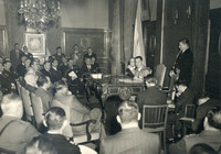 Juan Domingo Perón habla a interventores del Partido Peronista. A su lado, Héctor José Cámpora