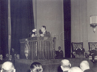 Discurso de Juan Domingo Perón durante el banquete con el Ejército, marina y aeronáutica. De fondo, el escudo justicialista y un afiche con los retratos de Eva y Juan Perón
