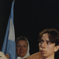 - Retrato de Nora Cortiñas sosteniendo una bandera argentina