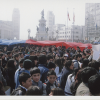 - Se observa una gran manifestación de personas sosteniendo una gran bandera de Chile. Detrás se observa el monumento a los Héroes de Iquique