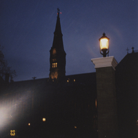 - Imagen nocturna de entrada de la Universidad de Harvard