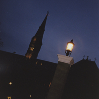 - Imagen nocturna de entrada de la Universidad de Harvard. Detalle de la torre del edificio