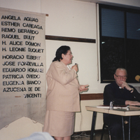 - Registro de expositora en el evento. Se observa sobre la pared afiche con los nombres de los detenidos-desaparecidos del grupo de la Santa Cruz