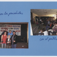 Album artesanal con fotografías y recortes de la visita de Nora Cortiñas a Drôme, Francia [02/04/2006]. Retratos grupales de Nora Cortiñas con periodistas y público