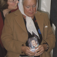 - Imagen de Nora Cortiñas con su pañuelo blanco y la foto de su hijo Gustavo Cortiñas