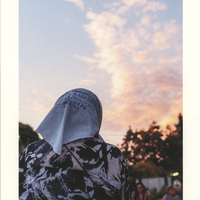 - Imagen de Nora Cortiñas de espaldas usando su pañuelo blanco. Al fondo se observa un grupo de personas mirándola