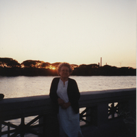 - Imagen de Nora Cortiñas en la costa de un río. Detrás se observa el atardecer