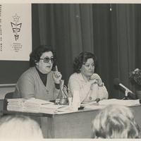 Registro de Madres de Plaza de Mayo en distintos eventos. Retrato de Nora Cortiñas y Hebe de Bonafini hablando en un evento en Suecia [1980]