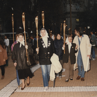 - Registro de marcha con antorchas. Retrato de Madres de Plaza de Mayo. Se identifica a Nora Cortiñas