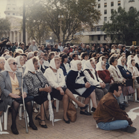 - Retrato de Madres de Plaza de Mayo. Detrás se observa a los asistentes al evento