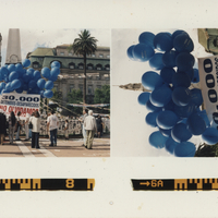 - Registro de la Pirámide de Mayo rodeada de las fotos de desaparecidos, globos azules y un cartel que dice "30.000 detenidos-desaparecidos No olvidamos". Vista general y detalle del cartel y los globos
