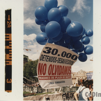 - Registro de la Pirámide de Mayo rodeada de las fotos de desaparecidos, globos azules y un cartel que dice "30.000 detenidos-desaparecidos No olvidamos, Madres de Plaza de Mayo Línea Fundadora". Detalle del cartel y los globos