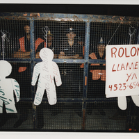 - Retrato de policías detrás de una valla. Sobre la valla se encuentran colgados carteles y afiches con siluetas de personas
