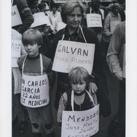 - Imagen de una mujer y dos niños llevando carteles con los nombres de personas desaparecidas