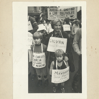 - Imagen de una mujer y dos niños llevando carteles con los nombres de personas desaparecidas