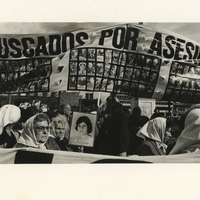 - Registro de movilización de Madres de Plaza de Mayo. Se observa una gran bandera con fotografías de represores que dice "Buscados por asesinos"
