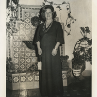 - Imagen de Azucena Villaflor vestida de largo. Al fondo se observa un patio, una fuente y plantas alrededor