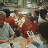 - Retrato de Madres de Plaza de Mayo, Línea Fundadora junto a otras personas en un bar. Se identifica a Nora Cortiñas