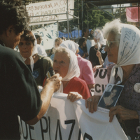 - Entrevista a Nora Cortiñas durante la marcha. A su lado se identifica a Lidia “Taty” Almeida y Mirta Acuña de Baravalle