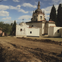 - Imagen del cementerio. Se observa la transecta de excavación y al fondo la capilla