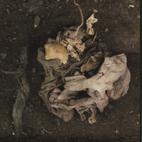 - Detalle de hallazgos en piso de excavación. Se observan restos óseos y textiles