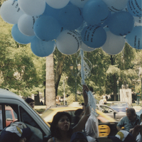 - Imagen de una persona sosteniendo globos celestes y blancos con la consigna "Cacerolazo contra la Corte Suprema de Justicia"