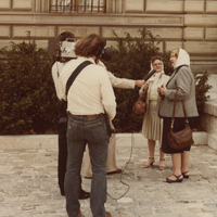 - Imagen de periodista realizando una entrevista a Madres de Plaza de Mayo. A su lado se identifica a Nora Cortiñas