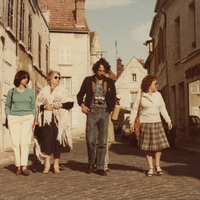 - Retrato de Madres de Plaza de Mayo junto a otras personas caminando por una calle de pueblo europeo